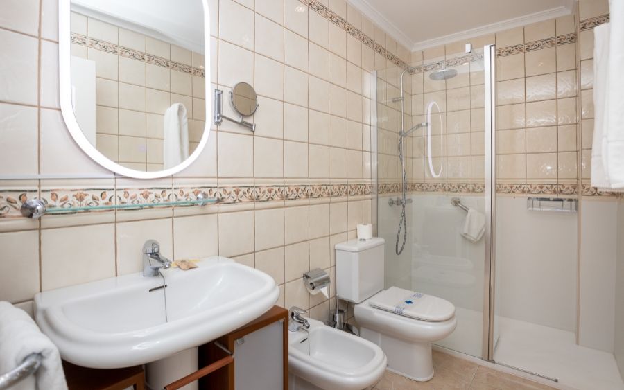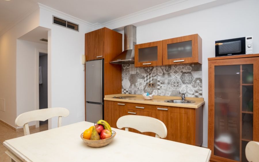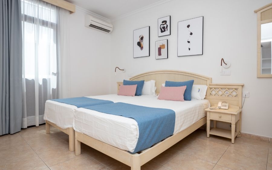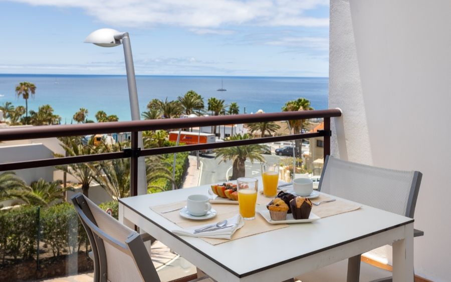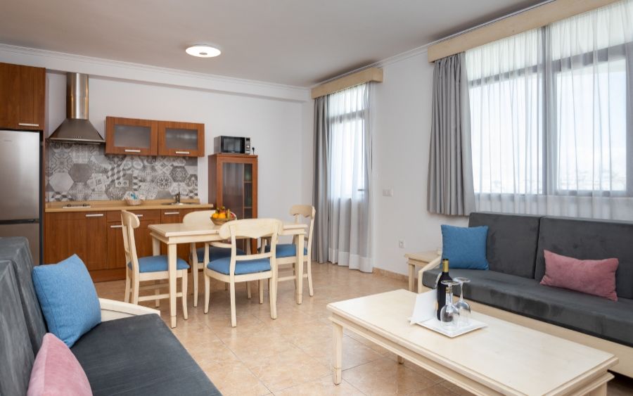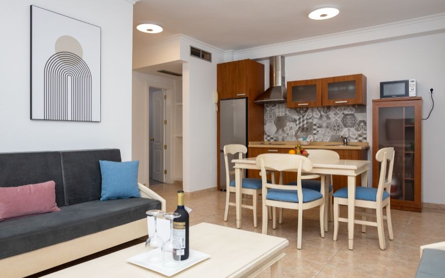 25 Apartamentos de 1 dormitorio con ocupación máxima de 3 personas: terraza o balcón con vistas. Salón, cocina totalmente equipada con todo lo necesario (vitrocerámica, frigorífico grande, tostadora, cafetera, calentador agua, microondas, menaje de cocina, baño con secador, TV plasma, caja fuerte y conexión a internet (incluídos), zonas comunes, solárium con hamacas, sombrillas, mesas, sillas, ducha, recepción, hall. Pack de bienvenida.